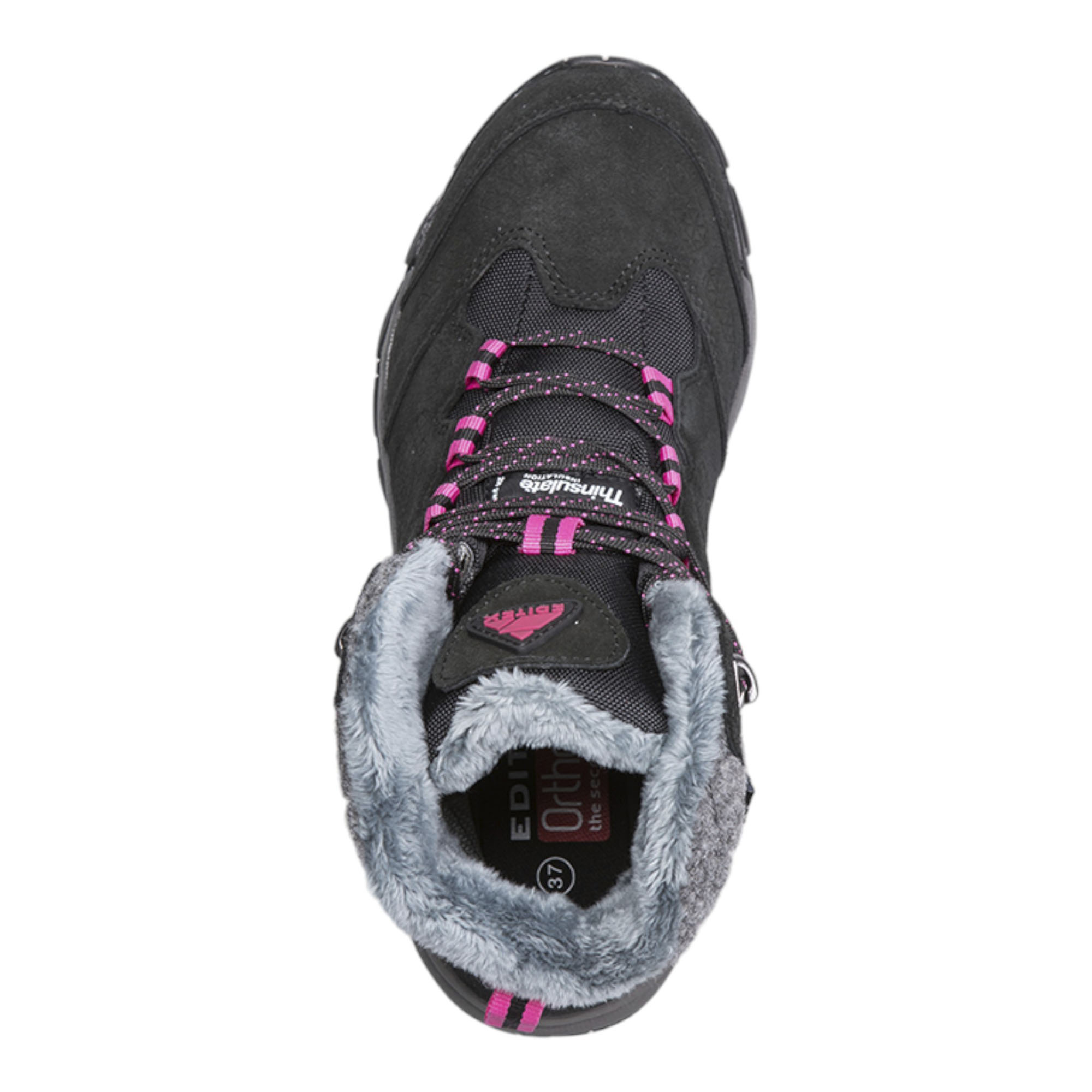Сочетая стильный контрастный дизайн вместе с качественной сборкой и материалами ботинки Editex Montreal станут отличным выбором для любителей активного отдыха или просто для обычных пеших прогулок по городу. Внешний слой ботинок выполнен на основе износостойкой замши, что в сочетании с водоотталкивающей обработкой Durable Water Repellent (DWR) позволяет ботинкам выдерживать попадание влаги и мокрого снега при ходьбе. Для дополнительной защиты от попадания влаги изделие оборудовано мембранной, произведённой по технологии Waterproof Windproof Breathable (WWB), благодаря микроскопическим порам обеспечивается вентиляция внутреннего пространства ботинок, защищая ноги от попадания влаги извне с сохранение комфортного микроклимата. Современный утеплитель Thinsulate за счёт полиэфирных микроволокон эффективно удерживает тепло, термоизолируя ноги владельца и позволяет с комфортом носить обувь в широком температурном интервале. Валяная шерсть на голенище ботинок придаёт не только особый вид изделию, но также защищает голень от холода и ветра. Специальная колодка позволила создать максимально удобную обувь для женской ноги, что в сочетании с антимикробными съёмными стельками OrthoLite, защищающие от неприятного запаха и обеспечивающие дополнительную вентиляцию стопы, позволяет ощущать комфорт даже при суровых погодных условиях. Промежуточная подошва EVA эффективно распределяет нагрузку при ходьбе, делая пешую прогулку мягкой и комфортной. Подошва Ultra Slip Protection (USP) обладает высокой гибкостью и износостойкостью благодаря прочной резине с развитым рисунком протектора, что обеспечивает надёжное сцепление с рельефом. Прочная шнуровка с крепкими петлями создаёт надёжную посадку на ноге. Крепкие материалы с прошивкой из двойной строчки позволяют ботинкам выдерживать длительное ношение и множественную чистку с сохранением свойств и цвета. Контрастный дизайн чёрного цветового исполнения с яркими розовыми петлями позволяет обуви сочетаться как со спортивной, так и с повседневной одеждой.Характеристики: